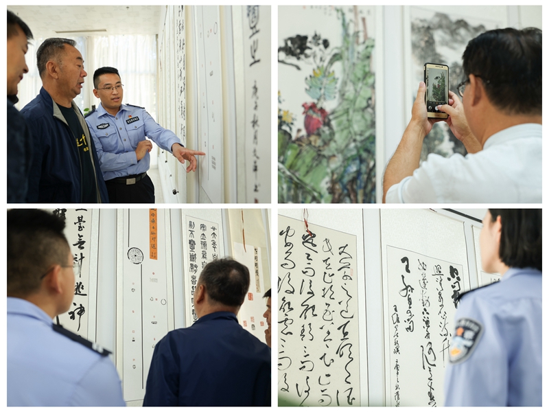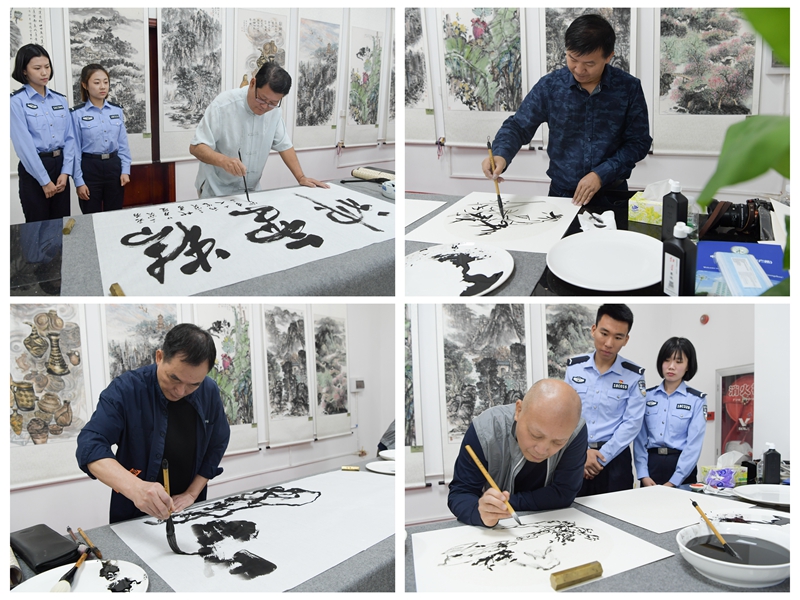 开展仪式后,校区潘慈平书记与来宾共同参观鉴赏了本次书画联谊活动展出的作品,各位艺术家现场挥毫,共同交流创作心得,研习书画技艺。本次警地书画交流活动计划为期一周,将以书法、国画为载体展览展出广东省书画艺术家及校区师生作品48副,为校区师生送来了一场书画艺术的盛宴。
