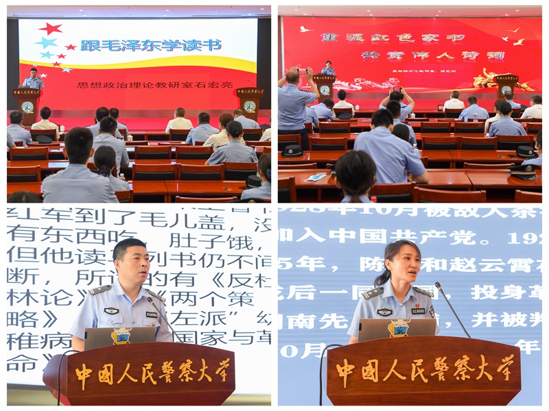 校区政治处与东江口海关高度重视此次共建活动,积极创新载体形式,充分挖掘教育资源,开展了内容丰富、内涵深刻的主题活动。双方共同聆听了基础部石宏亮博士题为《跟毛泽东学读书》的精彩授课;在基础部张艺彤老师的带领下,重温了感人肺腑的红色家书《烈士陈觉和妻子赵云霄的书信》,赏析并朗诵了毛泽东气势磅礴的诗词《忆秦娥·娄山关》;双方4名代表同志围绕基层党建和党史学习教育,开展了交流发言,分享了经验做法;海关的领导、同志在警务指挥学院张磊老师的组织下,开展了队列训练。