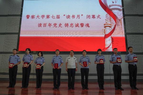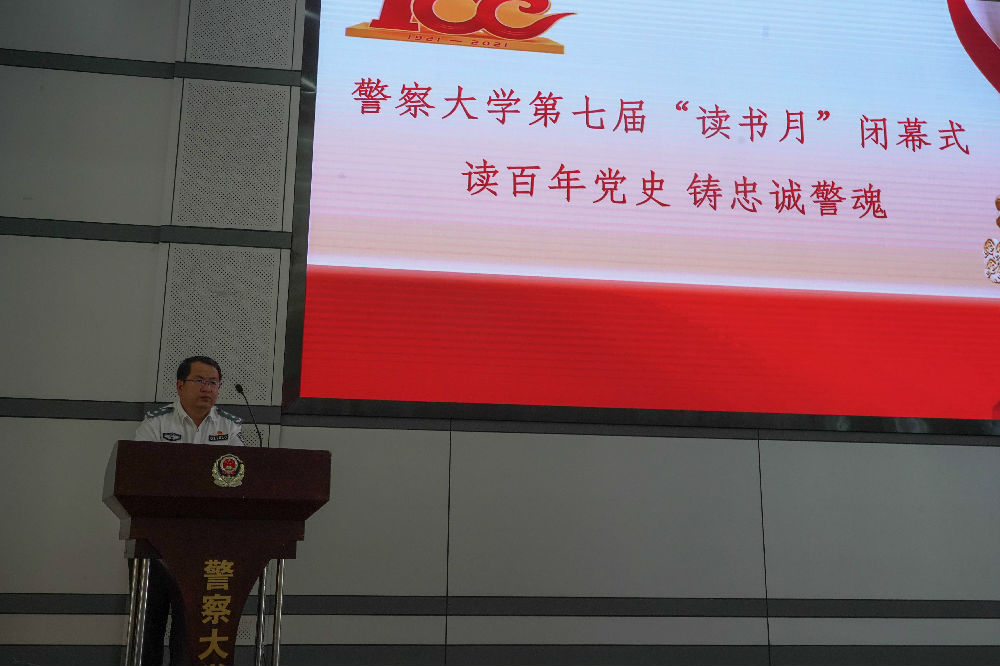 闭幕式上,回顾了活动期间的精彩场景。本届读书月设立了党史学习教育主题阅读专区,展出习近平总书记系列图书、四史类书籍1000余种;开展了“党史百年天天学”主题讲座21天打卡,全校1625人参与,在线提交心得38万余字;举办了“党旗下的警大梦”征文比赛,征集作品236份;评选了60名2020年度优秀读者;组织了“真人图书馆”、“读书沙龙”活动,营造了书香警大的阅读文化氛围。闭幕式还邀请了2名“优秀读者”代表和4名征文比赛获奖代表做交流发言,畅谈了自己读书学习的心得感悟,抒发了对国家、对警大的热爱以及励志报国、矢志从警的志向和情怀。随后,杜副校长为获奖代表颁发了获奖证书。