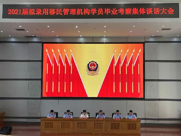 为认真做好2021届学生毕业工作,根据国家移民管理局通知精神,6月22日,国家移民管理局组织28个总站58名同志(包括通过视频参会的6个总站12名同志)来校开展为期2天的毕业生考察暨录用协议签订工作,6月22日上午,在D406报告厅召开考察集体谈话大会,学校闫胜志副校长、国家移民管理局干部人事司干部处尹子磊调研员出席会议并讲话,教务处、学生工作处、警令保卫处、纪检监察处、广州校区政治处、广州校区移民管理学院、广州校区警务指挥学院和各总站考察成员参加了会议。会议由马常凯处长主持。