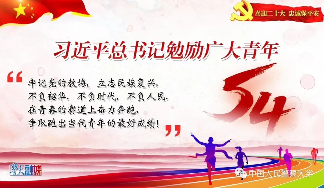 国势之强由于人,人材之成出于学。在五四青年节即将到来之际,习近平总书记来到中国人民大学考察调研,勉励广大青年在青春的赛道上跑出当代青年的最好成绩。立足新时代新征程,中国青年的奋斗目标和前行方向就是坚定不移地听党话、跟党走,努力成长为堪当民族复兴重任的时代新人,于时代洪流中踔厉奋发、勇毅前进。作为警大学子,我们更应时刻牢记身上的责任,要把今天的学业、明天的事业同国家的需要、人民的需要紧密联系起来,为成为一名优秀的人民警察而不懈奋斗!