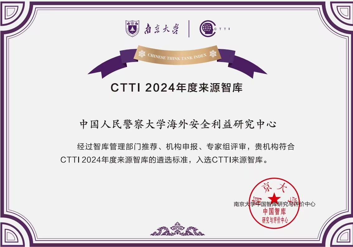 警察大学海外安全利益研究中心于2021年5月获批为教育部国别和区域研究备案中心。近三年,海外安全利益研究中心累计报送咨政建议40余份,出版专著7部,发表论文40余篇,主持国家级项目5项。相关成果被人民网、中国共产党新闻网、学习强国转发和《新华文摘》全文转载,并入选《2023年度中国十大学术热点》。此次海外安全利益研究中心成功入选CTTI来源智库并荣获一等奖,体现了警察大学咨政服务和智库建设工作已经进入新发展阶段。学校将以此为契机,全力推进内涵建设,努力产出更多服务国家安全战略、服务国际执法合作、服务新时代高素质公安专门人才培养的高品质成果。