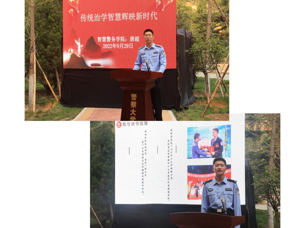 活动邀请了教师、学生代表和三位毕业校友,讲述他们书香为伴,砥砺前行的成长历程。智慧警务学院唐超教授,畅谈了汲取传统治学智慧,做大学问、真学问的学术追求;滕凯枫同学从诗词中感悟家国情怀,抒发了从警报国的志向;毕业校友何召华、杨勤敞和丁成稳,录制视频述说了他们立足本职学习实践、锤炼本领建功立业的奋斗足迹;刘筱萱和肖清水同学作为“青春对话未来——写给十年后的自己”书信征集活动获奖代表,展望了如何在新时代踔厉奋发、如何胜任未来的公安工作。活动现场展出的“警大阅读十二时辰”摄影比赛优秀作品,记录了警大学子从晨光微熹到暮色四合,不负韶华争朝夕的美好阅读瞬间,展现了警大丰富多彩的阅读文化氛围。