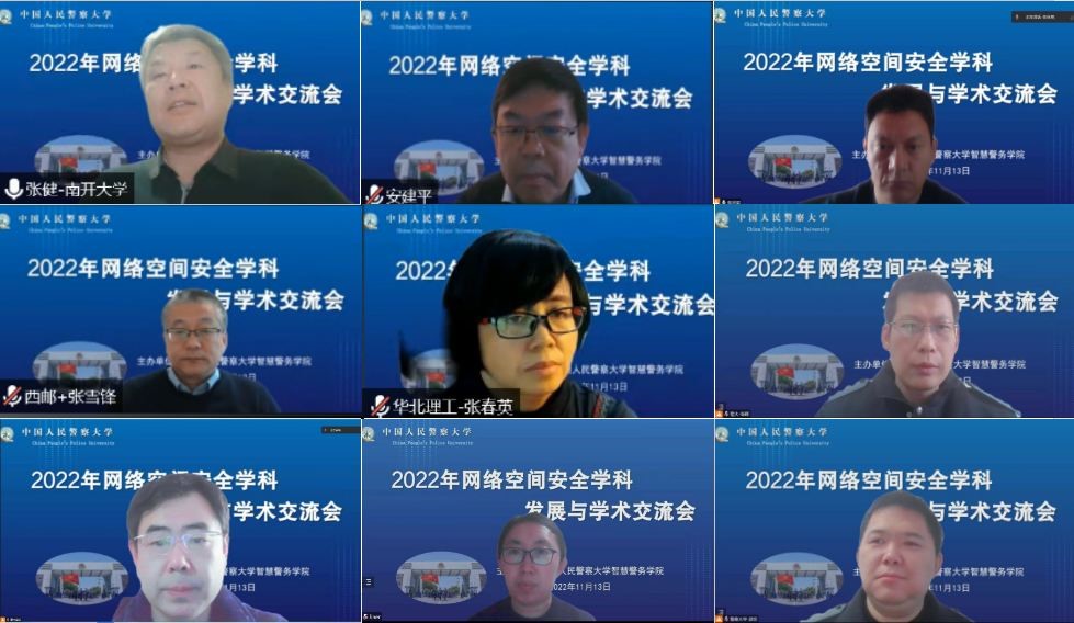 此次会议由智慧警务学院主办,网络空间安全学科建设点承办,会议主题围绕“网络空间安全学科建设与学术研究”,来自北京理工大学网络空间安全学院安建平院长、南开大学张健教授、华北理工大学张春英教授、西安邮电大学张雪峰教授、西北工业大学杨黎斌教授以及中国科学院计算技术研究所何清博士与警察大学50余名师生,通过线上线下相结合的方式参加了会议。