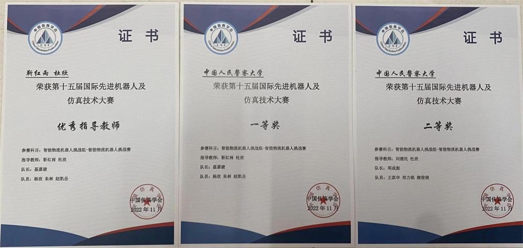 近日,从第十五届国际先进机器人及仿真技术大赛组委会传回喜讯,以警务装备技术学院学生为主要成员组建的警察大学机器人竞赛代表队在2022年11月举行的第十五届国际先进机器人及仿真技术大赛中,不畏强手,奋力拼搏,由聂嘉骏、杨欣、朱林和赵凯岳4名学生组成的代表队获得一等奖,由邓成彪、王淇申、郑力铭和赖俊晓4名学生组成的代表队获得二等奖,靳红雨教授、杜欣副教授两名老师获评大赛优秀指导教师奖。