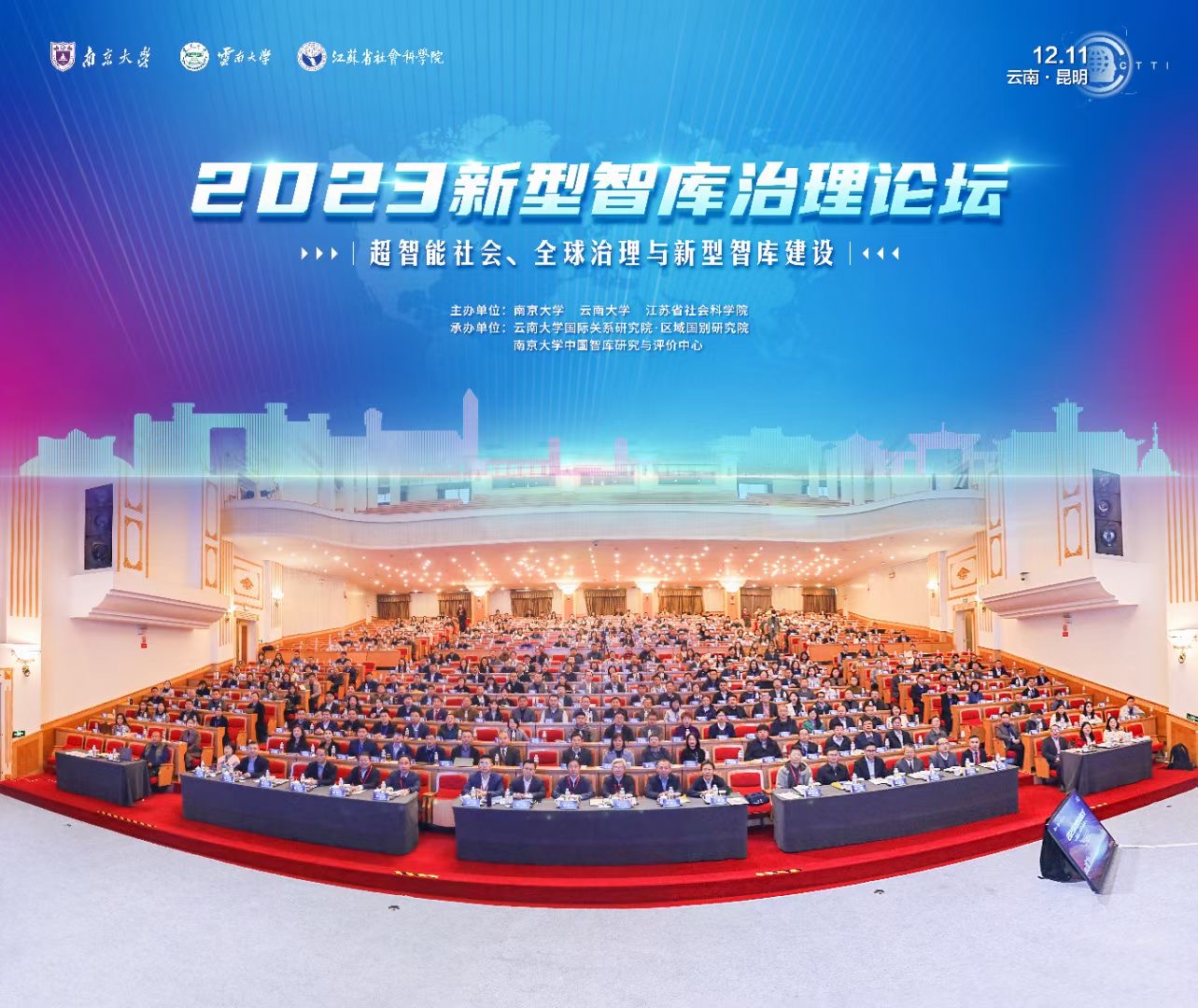 12月11日,南京大学、云南大学、江苏省社科院共同主办的“2023新型智库治理论坛”在云南省昆明市举行。本次论坛聚焦“超智能社会、全球治理与新型智库建设”主题,设置了主旨报告、新书发布、成果发布和专题分论坛等环节,吸引来自全国智库界、思想理论界专家和智库负责人等200余家单位的400余人参加。