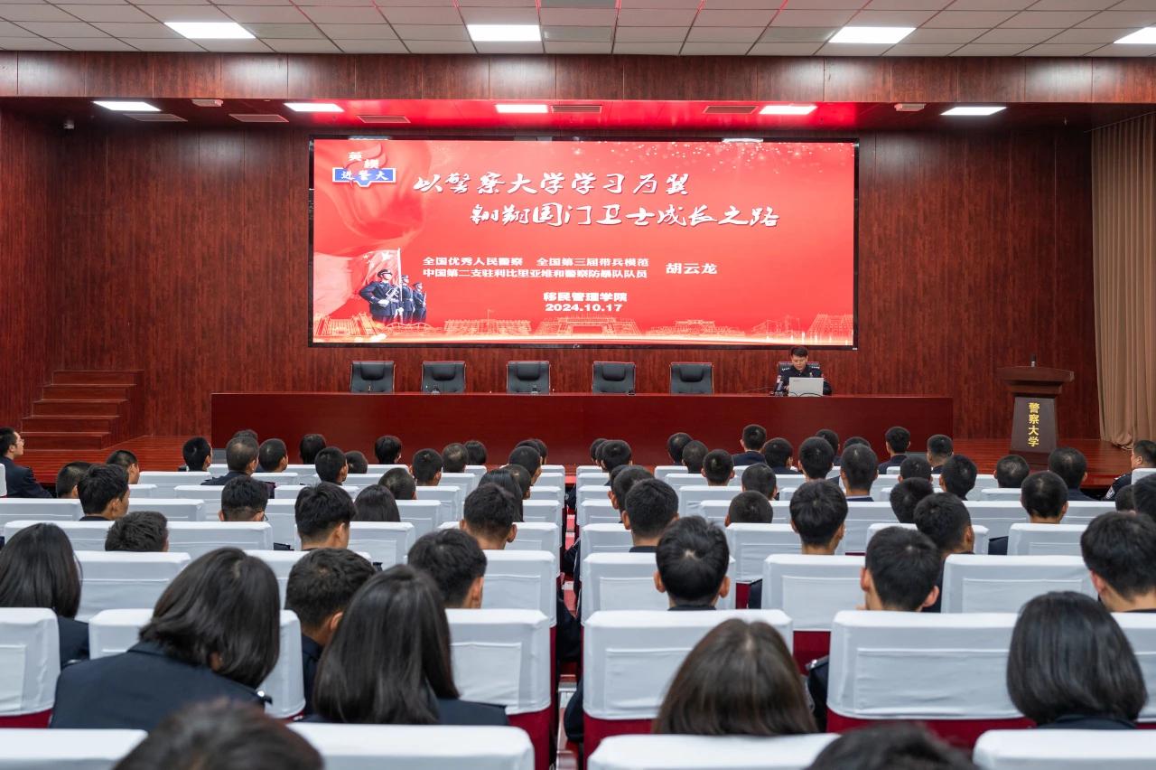 座谈会上,胡云龙与同学们亲切交流,讲述移民管理警察不为人知的故事,用自己的亲身经历向同学们诠释移民管理警察默默奉献、守护国门的神圣使命。胡云龙在专题授课中以《以警察大学学习为翼 翱翔国门卫士成长之路》为主题,围绕当前移民管理工作职业的简介、如何规划好警校的学习生活、该保持什么样的心态完成警大的学习生活、如何成为一名合格的移民管理警察、总结与展望等五方面与同学们展开交流。胡云龙寄语广大新生,要始终保持对警察职业的热爱和敬畏之心,不断提高自身业务能力和综合素质,为维护国家的安全和稳定贡献力量,将青春投入到建设社会主义现代化强国的伟大实践中!
