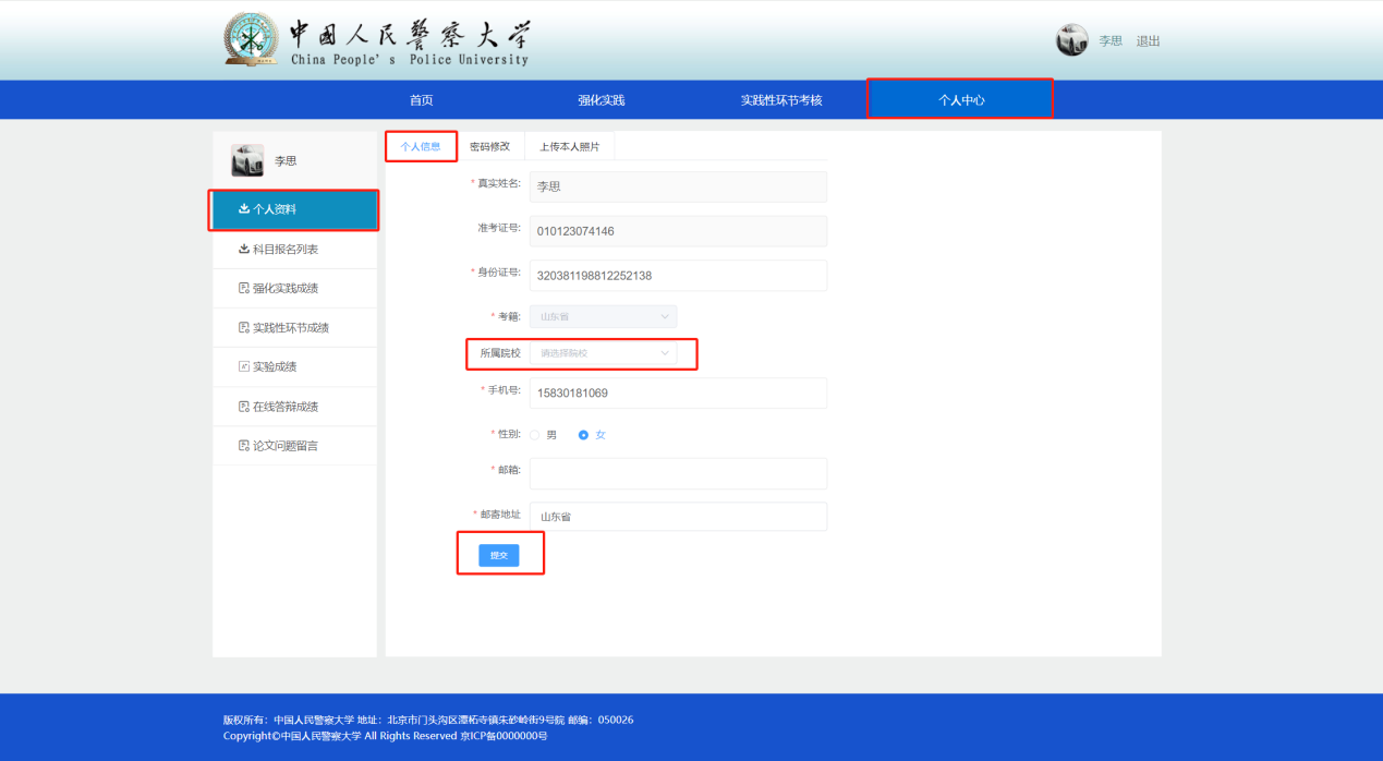 5.3进入个人中心,选择考生所属的试点院校、填写后点击提交,提交完毕之后重新登录。