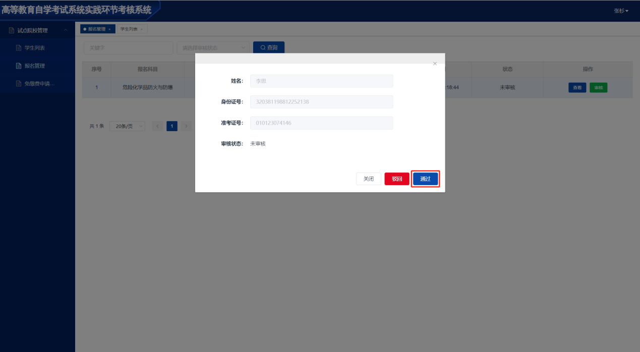 点击”审核“按钮,审核考生的考试报名申请(审核通过考生方可缴费)。