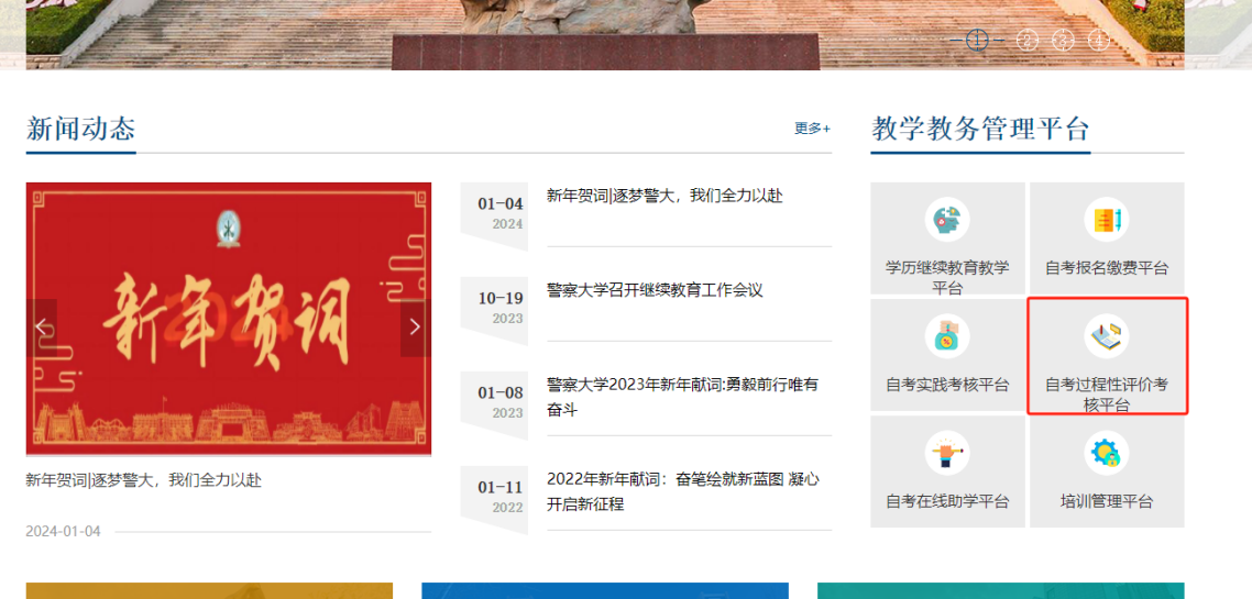 2、点击教学教务管理平台”栏目中的“自考过程性评价考核平台”或“自考报名缴费平台”进入如下页面。