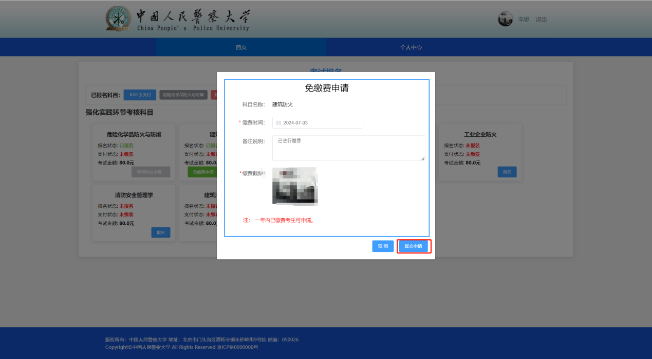 (1)一年内已缴费但未参加考核可申请免交费,考生申请免缴费,需填写信息点击提交