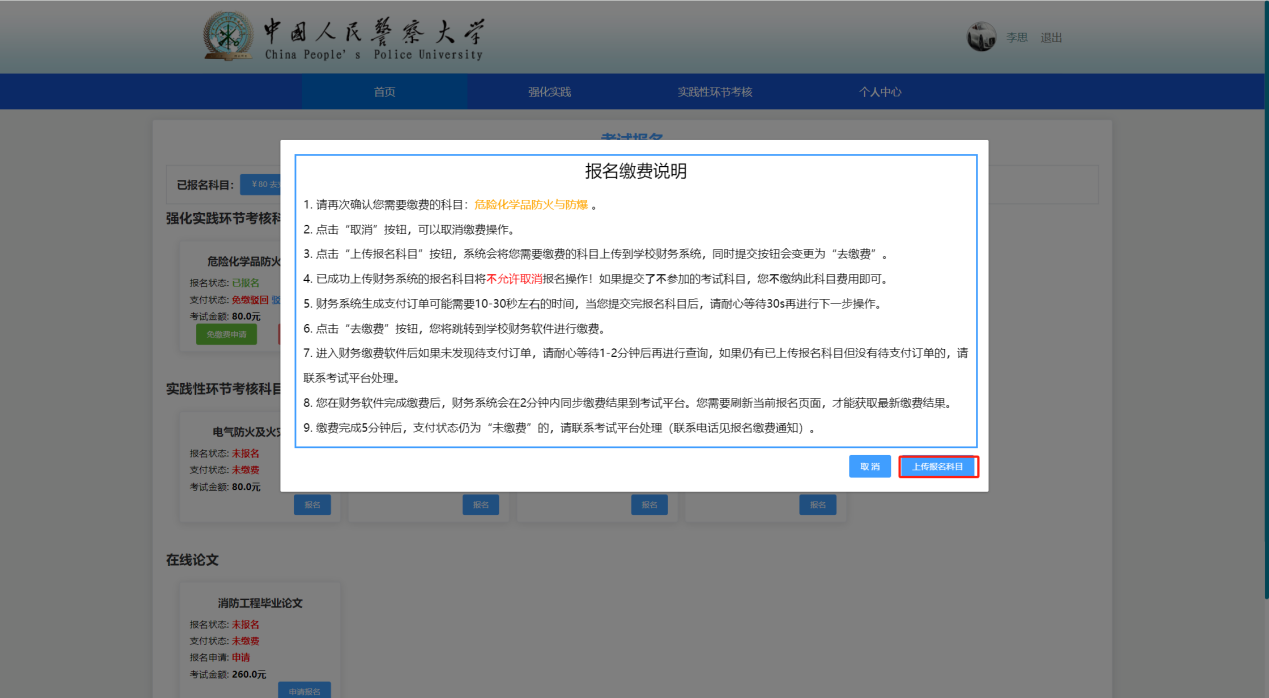(1)点击去支付跳出弹窗,仔细阅读报名缴费说明,确认无误后点击上传报考科目