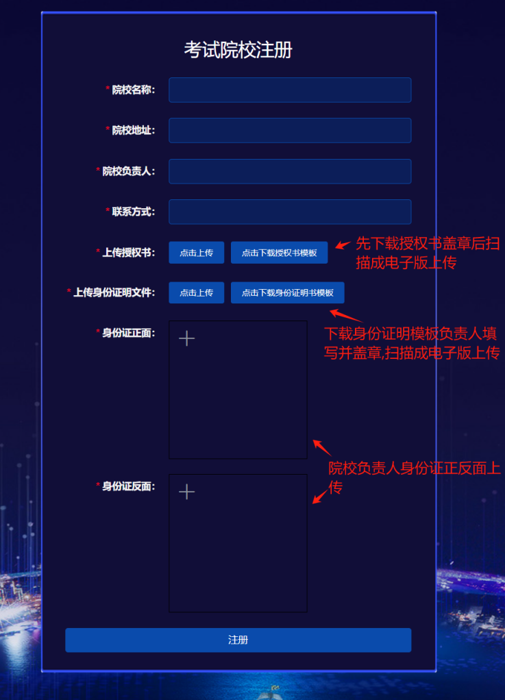 2.进入登录页面后,试点院校点击“考试院校注册”,按要求填写注册信息,下载《法定代表人身份证明书》和《授权委托书》盖章后扫描上传,等待主考学校审核。(审核通过后,主考学校通过注册时预留的联系方式发放账号和密码)