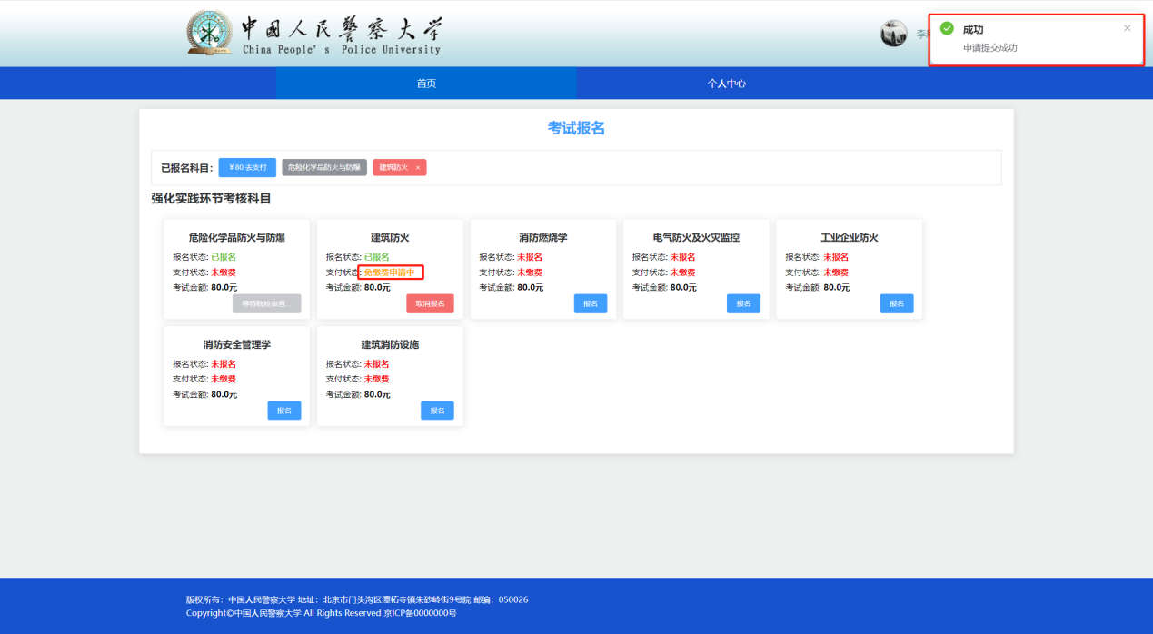 第一步、考生申请科目考试免缴费