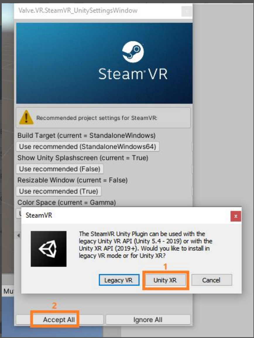 (4) SteamVR 插件导入成功后,弹窗中点击 UnityXR 按钮,然后点击 Accept All 按钮,如图所示: