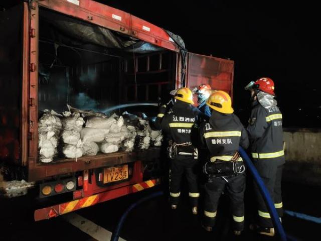 12月20日凌晨1时12分,赣州市夏蓉高速崇义段汝城往崇义县方向有一辆挂车着火,崇义县消防救援大队接警后调派一辆抢险救援车、一辆水罐车及14名消防指战员赶赴现场。