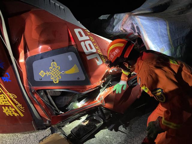 现场医护人员对其进行了初步检查,发现被困人员左腿膝盖部位被铁块砸伤,无法移动,无生命危险。了解情况后,消防队员利用液压剪扩钳及液压顶杆对驾驶室车门进行破拆,门打开后,继续对驾驶室进行扩张,增大救援空间。5时7分,高速救援工作人员利用车辆吊臂将车头吊起,创造救援空间。