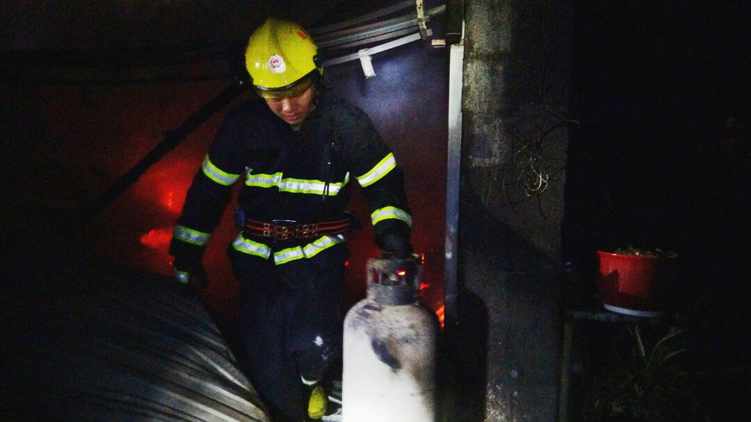 这时,指挥员果断地下达了作战命令:同时出两支水枪,从左右两个方向压住火势。明火刚被控制,刘浪自告奋勇地站出来请战,要求进入房内寻找煤气罐。指挥员同意后,刘浪在水枪的掩护下,冒着浓烟和高温,先后4次进入房内,从厨房拎出4个被熏得漆黑的煤气罐。经大火炙烤,煤气罐表面温度很高,随时都有可能发生爆炸。为防止爆燃,队友们马上用水枪对煤气罐进行冷却,然后转移到安全区域。众人悬着的心才放了下来。