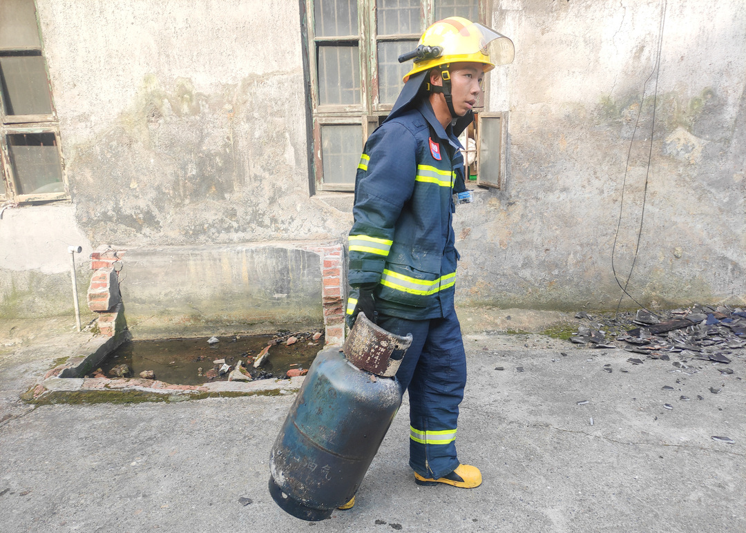 掌握情况后,指挥员立即下达作战命令,战斗迅速展开,救援人员立即铺设水带展开救援,将着火房屋门外初步的火势控制后,救援人员在房屋厨房位置发现液化气罐,无燃烧现象,随即使用水枪对罐体进行冷却,经过冷却降温,确认罐体不会发生爆炸后,救援人员将阀门关闭并拎出转移至空旷地面。经过30分钟的扑救,火势彻底被扑灭。