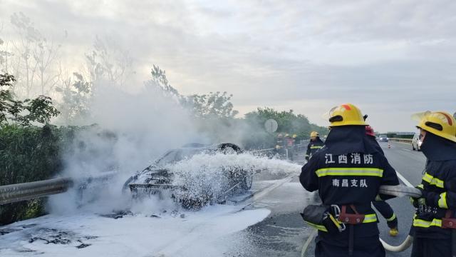 南昌:小车行驶中自燃 消防紧急救援