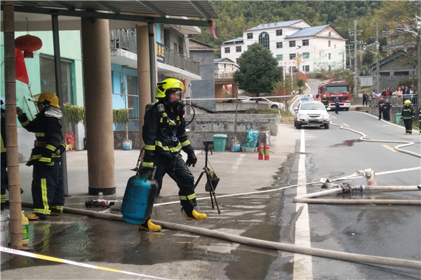 消防救援人员于12时07分到场,到场后,立即疏散距离火场尚近的少数群众、并将警戒距离扩大。同时,战斗预先展开,现场指挥员进行现场整体评估和火情侦察,依托罗马柱为掩体设置水枪阵地,对三个同时着火的液化气罐进行冷却强度由弱到强的逐步冷却。充分冷却后,现场指挥员果断将人员分为四组:一组保持供水不间断;二组负责一是持续冷却三个罐体,并掩护玻璃破拆。待三、四两组准备完毕后,一举消灭火势。在消灭火势后变换射流出喷雾强力稀释、并向窗外驱散液化气,最后喷雾掩护转移液化气罐;三组负责打碎厨房玻璃提供排气口、防止煤气泄漏后的集聚;四组负责检查确认本组人员个人防护装备穿戴情况、并佩戴空气呼吸器,待现场确定安全后,进入厨房将三个正在泄漏的液化气罐转移至安全地带,并关阀。于12时20分,将三个液化气罐全部转移出。最后,在开花水枪掩护下,救援人员将三个液化气罐进行了放空处理。于12时24分放空完毕。12时33分,与户主完成现场移交,消防救援人员返回。