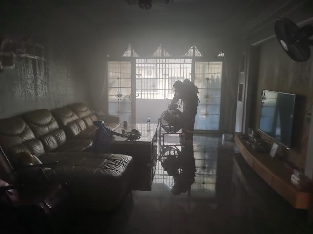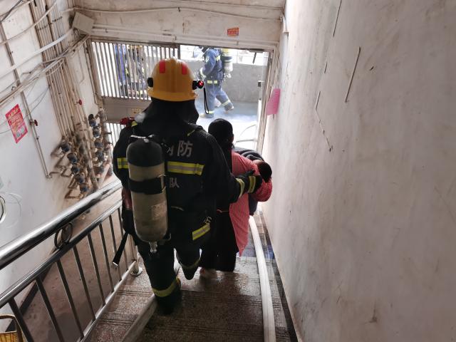 消防员立即戴上空气呼吸器进入火场,使用排烟机排烟,同时一边出水灭火,一边逐层疏散楼栋住户。12时15分,明火被成功扑灭,屋内浓烟散去,现场可以看到角落被烘烤烧毁的衣物,消防员前后共疏散群众40人,所幸无人员伤亡。