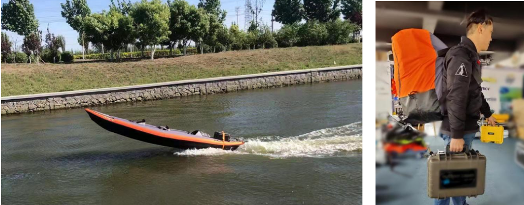 该成果总重量≤55kg,可由1~3人背负,现场组装模块,组装时间≤2min;具有远程控制、无人驾驶及自动返航、定点巡航等智能控制功能;装备最大载重300kg,最大速度≥4m/s,连续使用时间>40min;轻质救援艇尺寸382cm×108cm,重量17kg。
