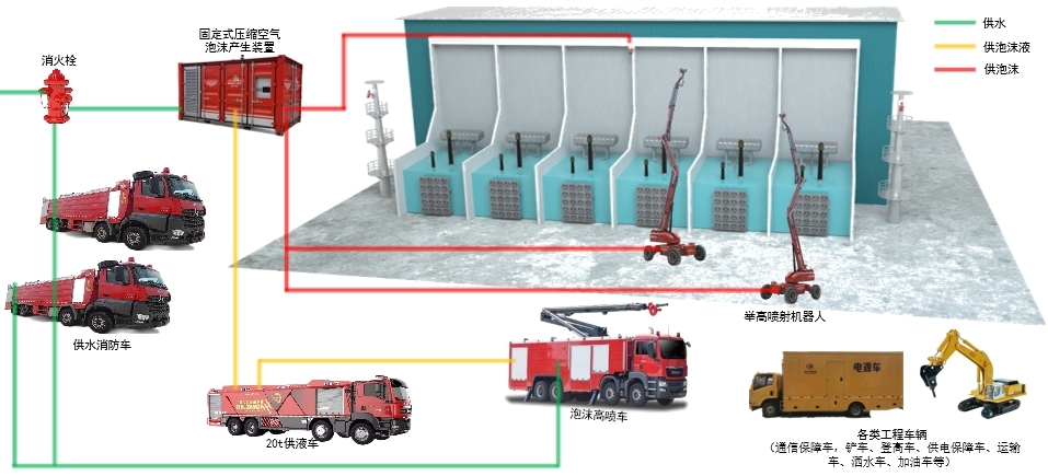 适用于220kV油浸变压器、500kV油浸变压器、±800kV特高压换流变压器、±1100kV特高压换流变压器等各种规格的大型油浸变压器及充油设施火灾扑救处置,也可在石化、高大空间厂房推广应用。