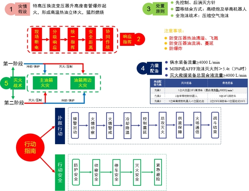 《特高压换流变火灾扑救技战术指南》主要包括处置原则、响应指挥、作战编程、扑救行动、行动安全及特高压换流变压器结构布置方式与处置难点。