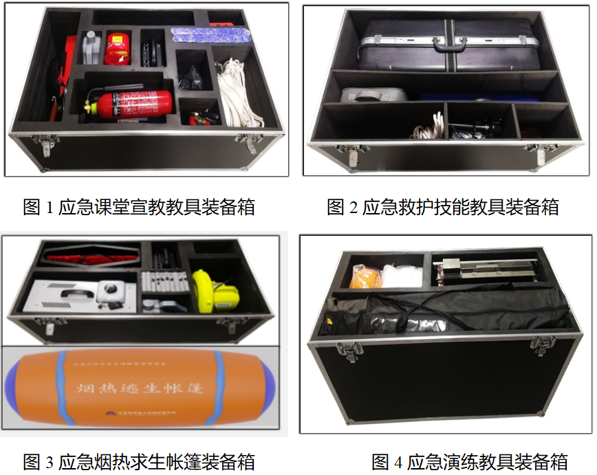 (一)应急演练教具装备箱主要用于应急疏散演练及初期火灾扑救培训教学使用,配置消防应急疏散演练、群体性逃生、应急逃生工具使用、初期火灾扑救等内容,满足疏散逃生演练教学需求。