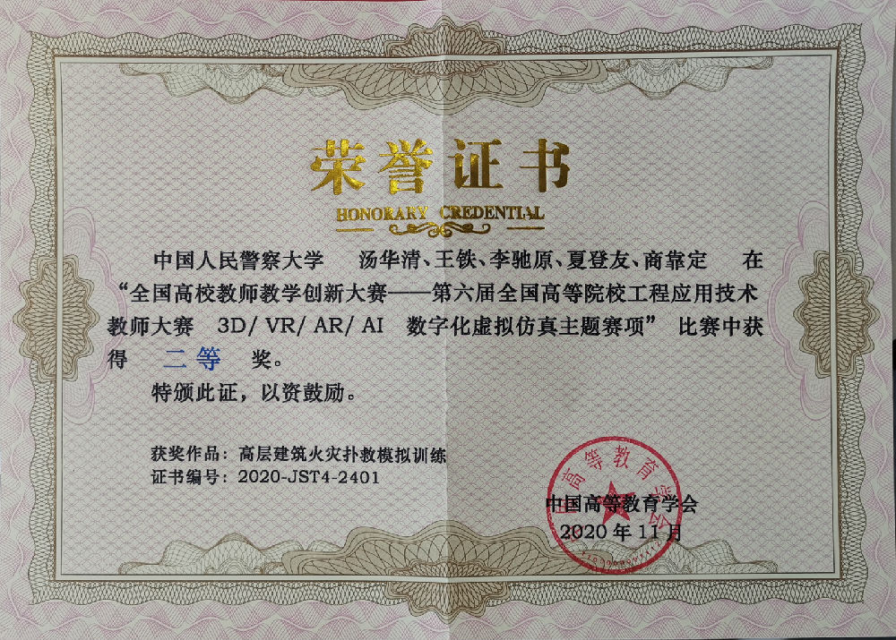 11月10日,由中国高等教育学会主办的全国高校教师教学创新大赛——第六届全国高等院校工程应用技术教师大赛-3D/VR/AR数字化虚拟仿真主题比赛颁奖典礼在长沙举行。本次大赛共吸引全国30个省,238所院校,445个团队报名,通过前期的校赛选拔和省赛评审,最终240支团队进入此次全国总决赛,96个团队获奖。我校救援指挥学院汤华清、王铁、李驰原等老师提交的作品《高层建筑火灾扑救模拟训练》获二等奖,智慧警务学院王威、田俊静及防火工程学院韩海云老师的作品《VR消防公众体验软件》以及智慧警务学院张双狮、王娟、王策源等老师的作品《城市建设发展辅助决策参谋》分别获三等奖。