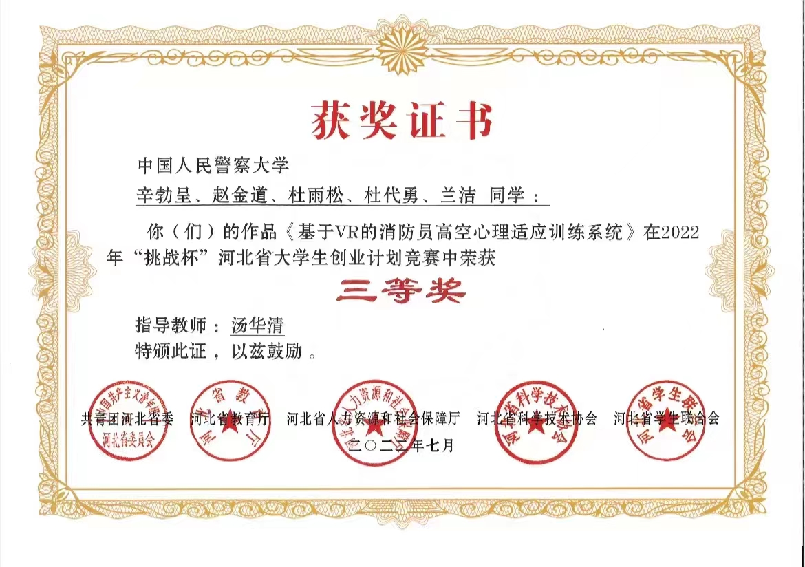 为培养学生科技创新能力,培训学生兴趣爱好,2022年4月救援指挥学院虚拟仿真实验教学中心兴趣小组,在科研处的精心组织与带领下,指导老师汤华清精心挑选研究(本科)生辛勃呈、赵金道、杜雨松、杜代勇、兰洁等同学组成参赛队伍,参加由共青团中央、教育部、中国科协、全国学联和省级人民政府主办的中国大学生创业计划竞赛,并提交作品《基于VR的消防员高空心理适应训练系统》,荣获2022年“挑战杯”河北省大学生创业计划竞赛三等奖。