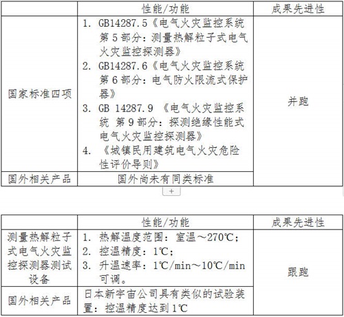 该成果依托公安部技术研究计划项目《供配电系统火灾危险性和电气火灾监控系统的应用研究》(项目编号:2016JSY****27),突破了采用特征频率分析故障剩余电流的关键技术,研究了电气火灾监控系统产品的应用技术和测试技术,研制了测量热解粒子式电气火灾监控探测器测试装置,制定了国家标准GB 14287.5《电气火灾监控系统 第5部分:测量热解粒子式电气火灾监控探测器》(送审稿)、GB 14287.6《电气火灾监控系统 第6部分:电气防火限流式保护器》(报批稿)、GB 14287.9《电气火灾监控系统 第9部分:探测绝缘性能式电气火灾监控探测器》(送审稿)和《城镇民用建筑电气火灾危险性评价导则》(征求意见稿),解决了电气防火限流式保护器、测量热解粒子式电气火灾监控探测器和探测绝缘性能式电气火灾监控探测器等电气火灾监控系统产品标准化设计、生产、应用的问题,同时为民用建筑电气火灾危险性评价工作提供了依据。