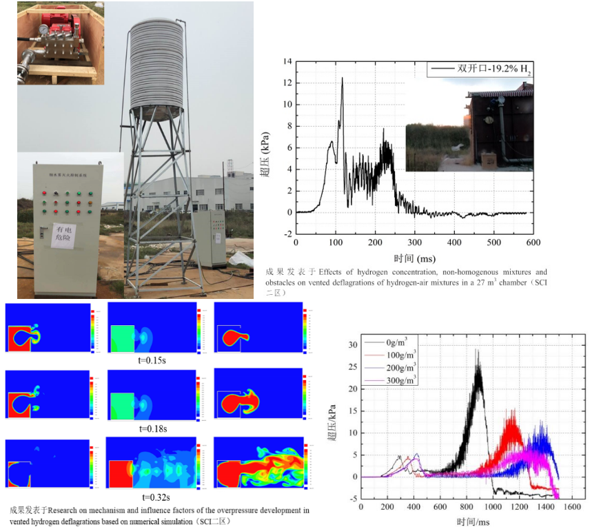 该成果面向氢能源应用场所的爆炸防控需求,基于实尺度的受限空间燃爆泄压模拟与爆炸抑制实验平台,创新性地研究了不同泄爆口位置数量、氢浓度梯度及障碍物拥塞比等复杂因素对氢泄爆过程及外部二次爆炸引发机制的影响,建立了受限空间氢泄爆典型参数的计算模型,提出了氢爆炸泄压关键技术;同时,研究了泄爆与惰化抑爆联合作用下受限空间内压力、火焰的演变过程,揭示了不同细水雾参数对氢爆炸惰化抑制效果的影响规律,提出了氢惰化抑爆关键技术。