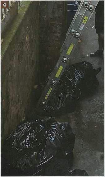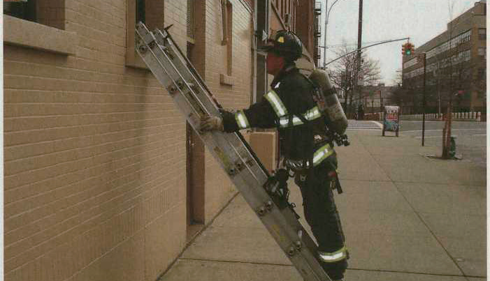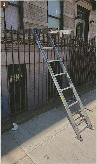 面对铁栅栏时,在一楼搭梯子的一个简单而快速的解决方案是使用 A 型架组合梯。不要从人行道上部署这种梯子,以悬臂的姿势越过围栏。梯子在这个位置时,将很难攀爬、横移和操作。当你和受害者在上面移动时,它也可能从窗台滑落。如果它滑出窗台,你和受害人都可能向下坠入”护城河”而受伤(照片 3)。