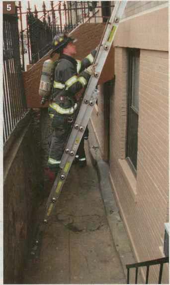 当你爬上梯子时,你可能要从侧面登上梯子。由于梯子的屁股靠着地基墙,在有限的空间内,你可能无法佩戴自给式呼吸器(SCBA)从最低的梯子爬上去。另外,在下来的时候,你将无法在底层梯子上走下来,你必须走到一边。由于受害者没有佩戴 SCBA,即使有墙在那里,他们通常也能从梯子上走下来。但是,一定要确保你支持他们,直到他们走到地面上(照片 5)。