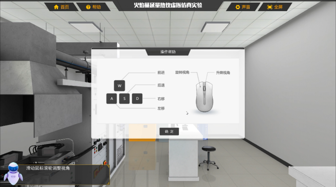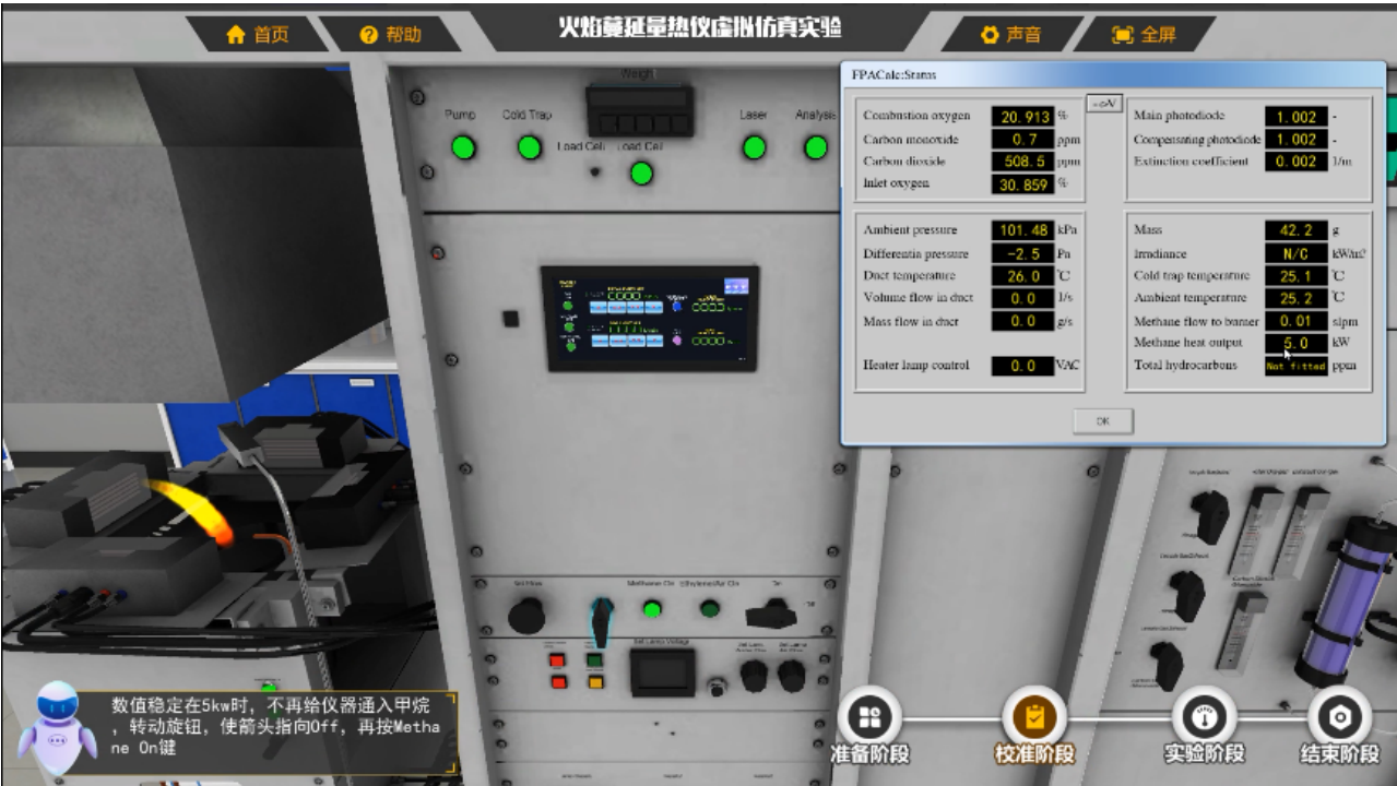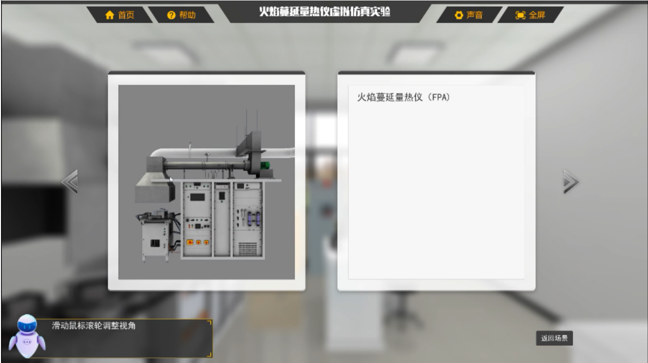 火焰蔓延量热仪虚拟仿真实验软件项目以实验室、FPA仪器、通风柜、空气压缩泵、水阀、电源开关箱和管道为对象建立虚拟训练场景,主要操作练习模块包括设备认知、仪器打开前的准备工作、仪器校准工作、PMMA材料燃烧性能测定以及结束阶段模块。通过本实验,帮助学习者进行FPA操作练习,提高人员大型设备操作和测试能力。