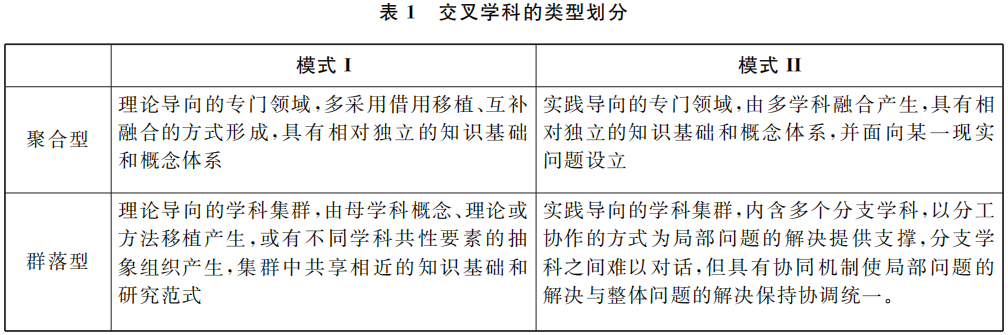 本研究分类的一个维度是交叉学科的知识生产方式。英国社会学家吉本斯认为,现有的知识生产大致可分为两类:知识生产模式I(以下简称模式I)以传统学科为中心开展知识生产,将学术共同体的同行评议作为评价学科内部知识创新的重要方式;知识生产模式II(以下简称模式II)以问题为中心开展知识生产,关注知识的社会影响,采用多元评价的方式。不同生产模式下的交叉学科呈现不同特征: